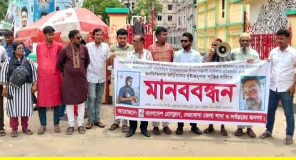 নেত্রকোনায় গণমাধ্যম কর্মীর উপর সন্ত্রাসী হামলার প্রতিবাদে মানববন্ধন অনুষ্ঠিত