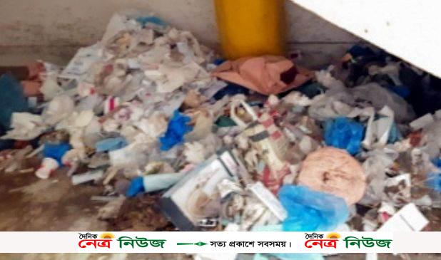 মোহনগঞ্জ উপজেলা স্বাস্থ্য কমপ্লেক্সে যক্ষ্মা ও কুষ্ঠ বিভাগের সামনের সিঁড়ির নিচে আবর্জনার ভাগাড়,