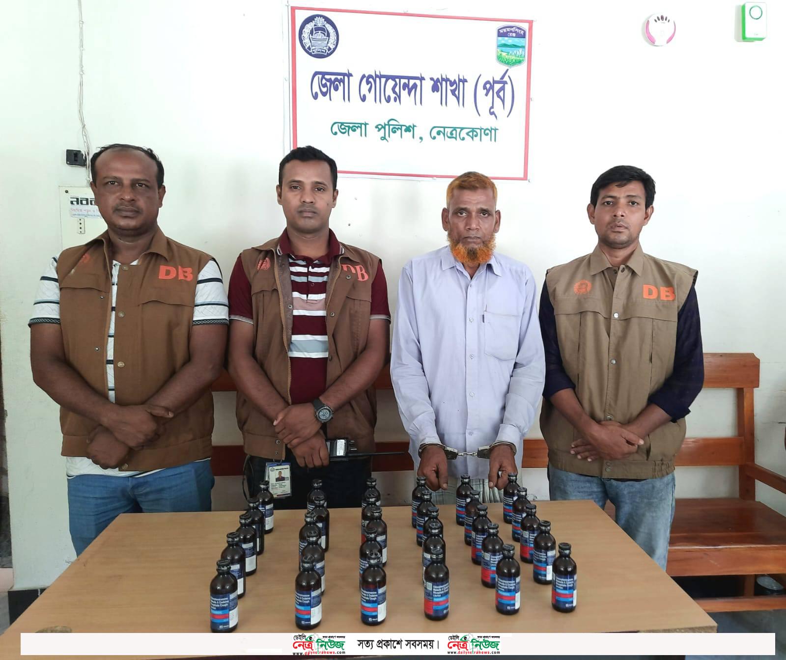 পুলিশ সুপার মোঃ ফয়েজ আহমেদের তত্ত্বাবধানে ওসি, ডিবি (পূর্ব ) মোঃ সায়েদুর রহমানের দিক নির্দেশনায় এসআই(নিঃ)/মো: সাদ্দাম হোসাইন সঙ্গীয় ফোর্সসহ বিশেষ অভিযান পরিচালনা করিয়া জেলার কলমাকান্দা থানাধীন পশ্চিম লেংগুড়া বাজারস্হ জনৈক মেহেদী কম্পিউটারের দোকানের সামনের পাকা রাস্তার উপর হইতে মেনকী ফান্দা গ্রামের বাসিন্দা মোঃ হরমুজ আলীর ছেলে মোঃ সাহেদ আলী(৫৫) নামের এক মাদক ব্যবসায়ীকে(৩০ বোতল ) আমদানি নিষিদ্ধ ফেন্সিডিল সহ (৯ জুন) শুক্রবার রাত ১টার দিকে আটক করে।