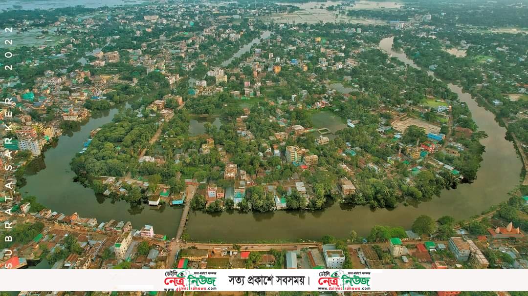 নিচে ডান দিকের যে কোনায় কালীবাড়ি মন্দিরটি দেখা যাচ্ছে সেখানে ছিলো কালীবাড়ি ঘাট। যে ব্রীজটি দেখতে পাচ্ছেন সেটি থানার মোড়ের ব্রীজ এবং সেখানেই ছিলো থানা ঘাট। মগড়া নদীকে তো দেখতেই পাচ্ছেন।
