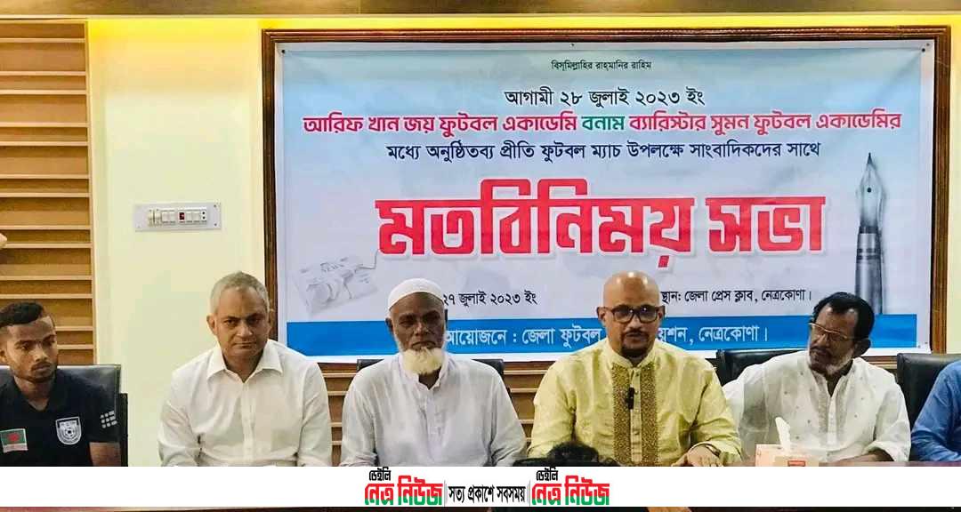 আজ বৃহস্পতিবার দুপুরে নেত্রকোনা প্রেসক্লাব মিলনায়তনে মতবিনিময় সভায় বীর মুক্তিযোদ্ধা সাবেক ফুটবলার হায়দার হাজান চৌধুরীর সভাপতিত্বে প্রধান অতিথি হিসেবে উপস্থিত ছিলেন: বাংলাদেশ জাতীয় ফুটবল দলের সাবেক অধিনায়ক,সাবেক কৃতি ফুটবলার ও সাবেক যুব ও ক্রীড়া উপমন্ত্রী আরিফ খান জয়, বিশেষ অতিথি হিসেবে উপস্থিত ছিলেন: জয় ফুটবল একাডেমির কোচ জাতীয় ফুটবলার অমিত খান শুভ্র,সাংবাদিক এম ফকরুল হক,সাবেক ফুটবলার আব্দুল কাদির,জাতীয় দলের ফুটবলার পাপন সিংহ সহ আরো অনেকেই।
