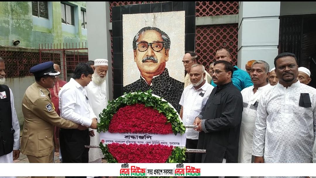 কর্মসূচির অংশ হিসেবে সকাল ১০.০০ টায় সুনামগঞ্জ ঐতিহ্য জাদুঘর প্রাঙ্গণে স্থাপিত জাতির পিতা বঙ্গবন্ধু শেখ মুজিবুর রহমান এঁর প্রতিকৃতিতে পুষ্পস্তবক অর্পণ এবং সকাল ১০.৩০ টায় জেলা মুক্তিযোদ্ধা কমপ্লেক্সে স্থাপিত জাতির পিতার প্রতিকৃতিতে পুষ্পস্তবক অর্পণ করেন সুনামগঞ্জ জেলা প্রশাসক দিদারে আলম মোহাম্মদ মাকসুদ চৌধুরী, এ সময়ে সুনামগঞ্জ-১ আসনের জাতীয় সংসদ সদস্য ইঞ্জিনিয়ার মোয়াজ্জেম হোসেন রতন, সুনামগঞ্জ জেলা আওয়ামীলীগের সভাপতি ও জেলা পরিষদের চেয়ারম্যান নুরুল হুদা মুকুট, সুনামগঞ্জ পুলিশ সুপার মোহাম্মদ এহসান শাহ্, জেলা আওয়ামীলীগের সাধারণ সম্পাদক নোমান বখ্ত পলিন, পৌর মেয়র নাদের বখ্ত, সিভিল সার্জন ডাঃ আহম্মদ হোসেন, স্থানীয় সরকার উপপরিচালক মোহাম্মদ জাকির হোসেন,
