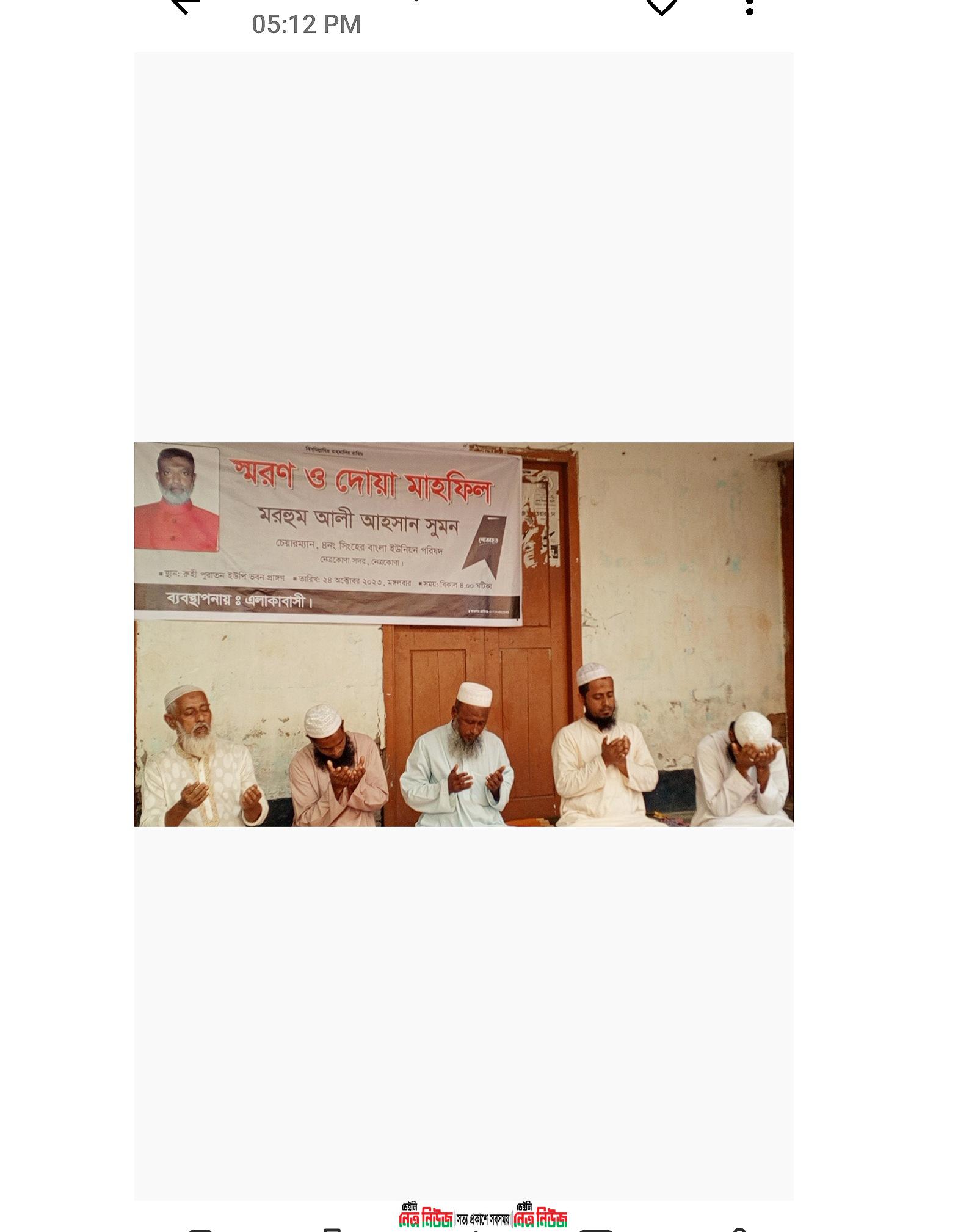 নেত্রকোনা সদর উপজেলা ৪ নং সিংহের বাংলা ইউনিয়নের চেয়ারম্যান মরহুম আলী আহসান সুমনের স্মরণ সভা ও দোয়া মাহফিল অনুষ্ঠিত হয়েছে।