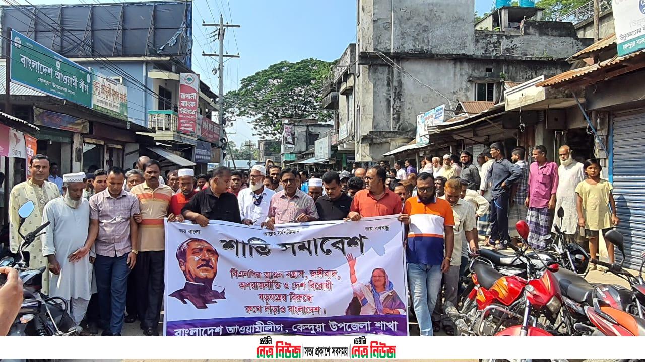 শনিবার (২৮ অক্টোবর) দুপুরে কেন্দুয়া উপজেলা আওয়ামী লীগের উদ্যোগে দলীয় কার্যালয় থেকে বিক্ষোভ মিছিলটি পৌর শহরের গুরুত্বপূর্ণ সড়ক প্রদক্ষিণ শেষে আ.লীগ সভাপতি এডভোকেট আব্দুল কাদির ভূঞার সভাপতিত্বে কেন্দুয়ার পুরাতন বাস ষ্ট্যান্ডে শান্তি সমাবেশ অনুষ্ঠিত হয়।