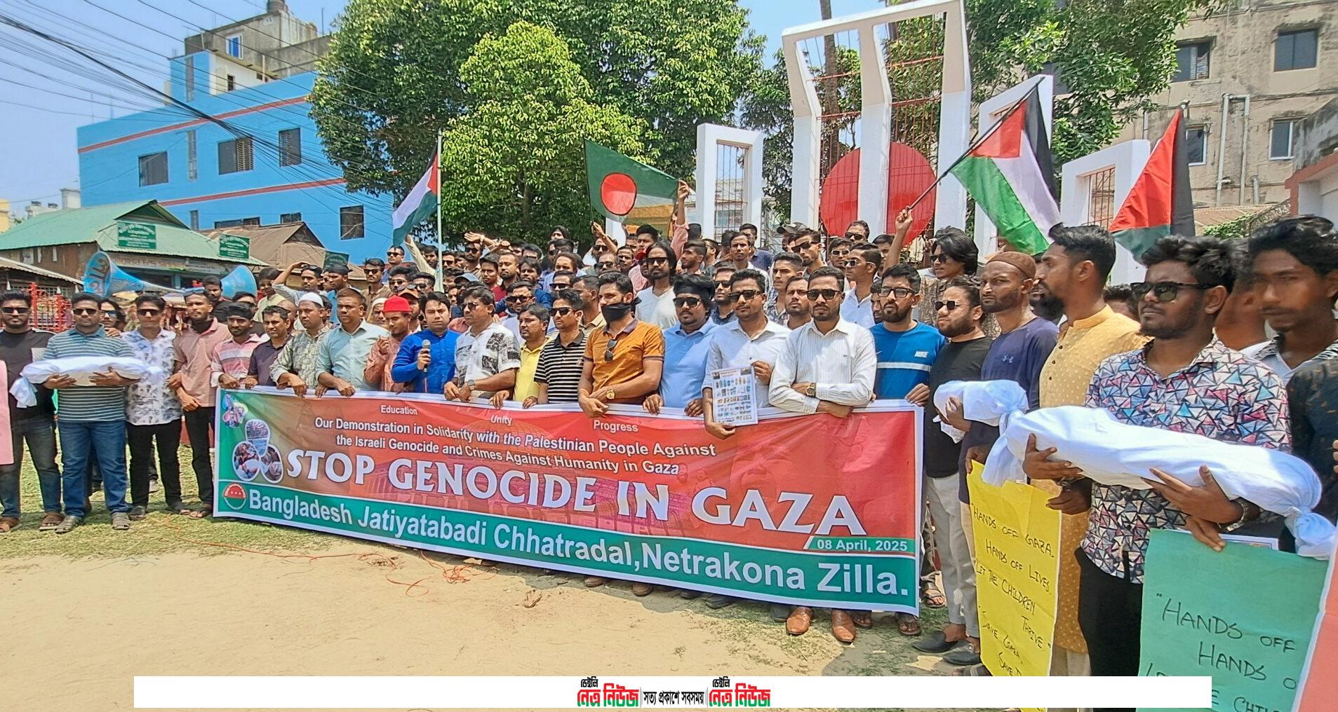 ফিলিস্তিনে ইসরায়েলের গণহত্যার প্রতিবাদ এবং ফিলিস্তিনের মানুষের প্রতি সংহতি জানিয়ে নেত্রকোনায় মঙ্গলবার দুপুরে জেলা ছাত্রদলের উদ্যোগে বিক্ষোভ মিছিল ও সমাবেশ হয়। শহরের কেন্দ্রীয় শহীদ মিনার থেকে মিছিলটি বের করে শহরের বিভিন্ন সড়ক প্রদক্ষিণ করে মুক্তারপাড়া এলাকায় জেলা প্রেসক্লাবের সামনে গিয়ে শেষ হয়। পরে সেখানে সংক্ষিপ্ত সমাবেশ করা হয়।